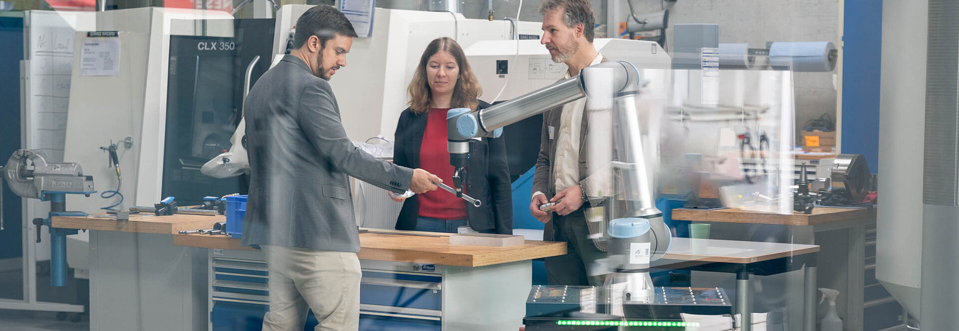 Prof. Alexander Schiendorfer, Pauline Steffel and Prof. Jürgen Bock working together with R10-D10 in the Laboratory for Production Engineering.