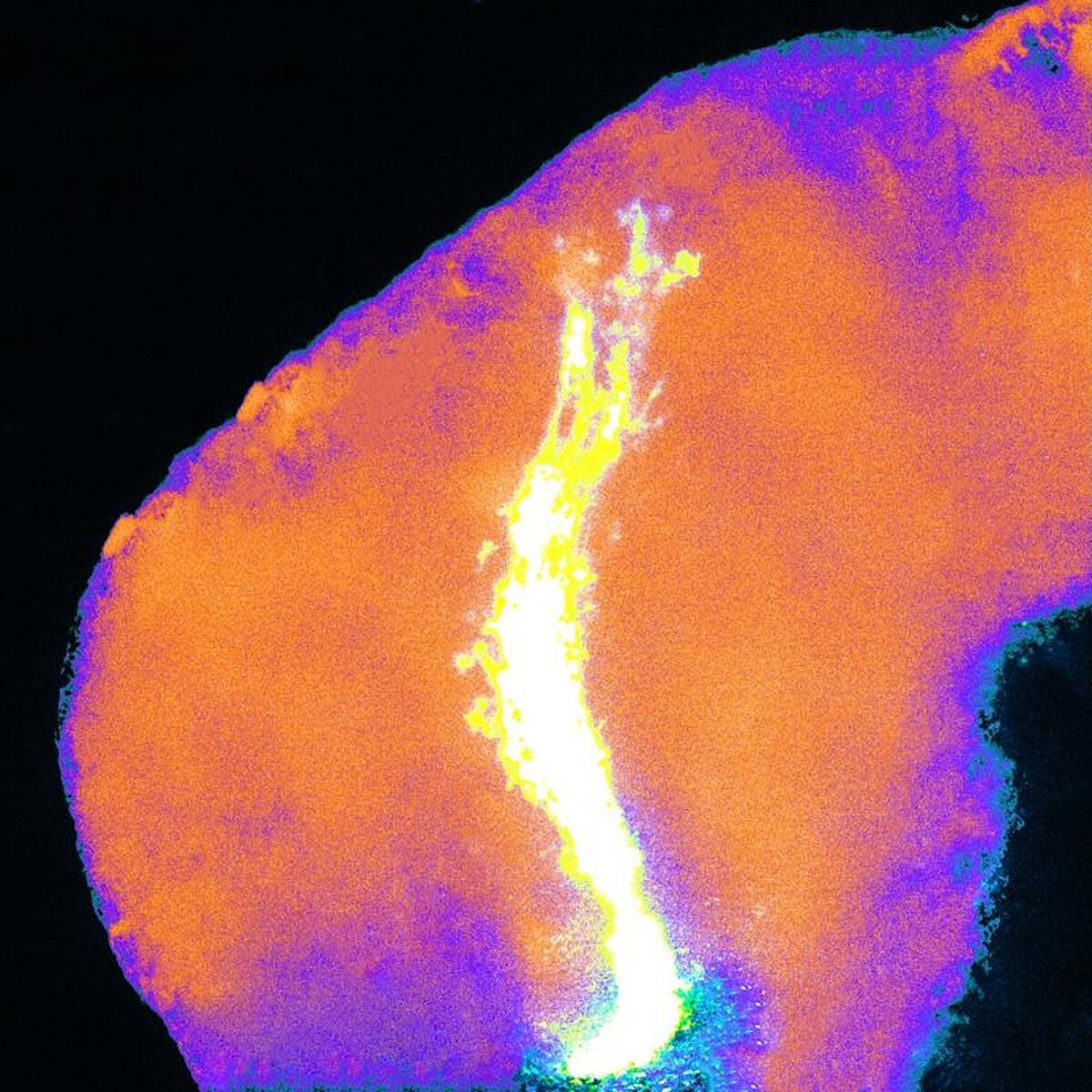 In frog brains (orange-blue), developing axons from the eye (yellow-white) follow a specific path to reach their final destination. Along the way, they make a characteristic turn. This turning is mediated by both chemical and mechanical signals. Sudipta Mukherjee