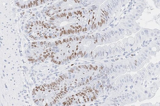 Intestines one week after abdominal irradiation, showing proliferating epithelial cells (in brown) © TUM