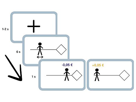 ‘This clearly demonstrated the so-called ingroup bias. People prefer to approach their own kind and favour individuals who belong to their own group,’ explains Grit Hein. To test whether financial incentives could change this approach-avoidance behaviour, the test subjects were given a small cash prize with varying probabilities when they approached the figure symbolising the foreign group. As soon as they approached the symbol of their own group again, money was deducted from their prize. ‘We bribed them, in a sense,’ says Grit Hein. ‘It was only a minimal amount, 5 pence, but we know from other studies that this works very well.’ However, the study participants were not aware of the financial incentive at the outset. They first had to learn which behaviour would bring them the greatest profit.