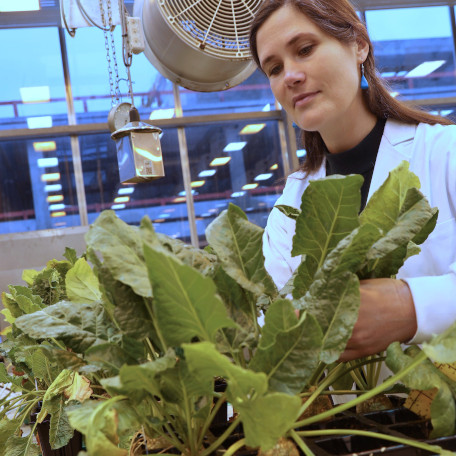 Early in the morning, Prof. Aline Koch enters the greenhouse in the new biology building at the University of Regensburg. This is where she plans the next applications of RNA technology for different varieties of sugar beet. The effectiveness and stability of RNA active ingredient sprays are tested here under controlled conditions before the most promising candidates undergo further trials under field conditions.